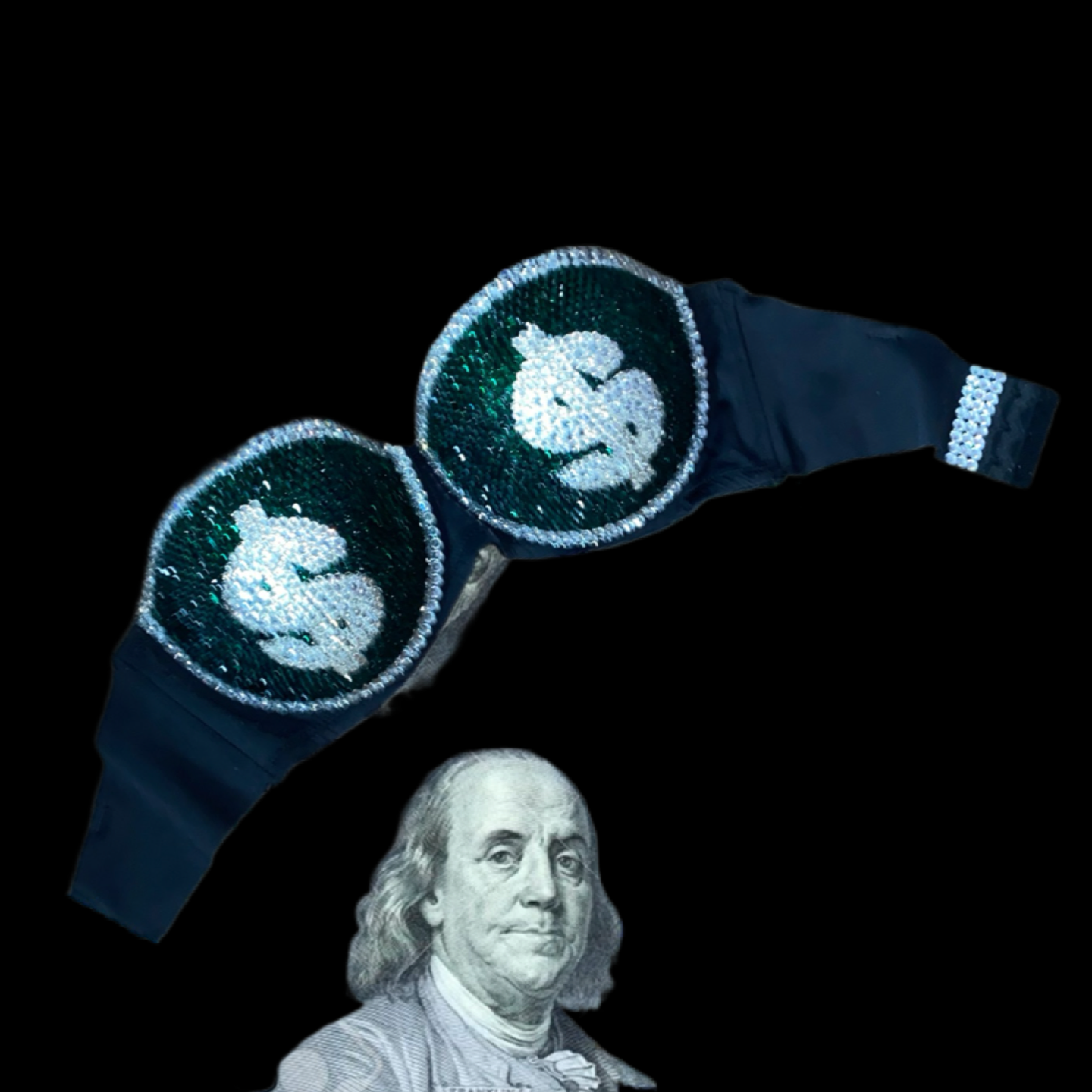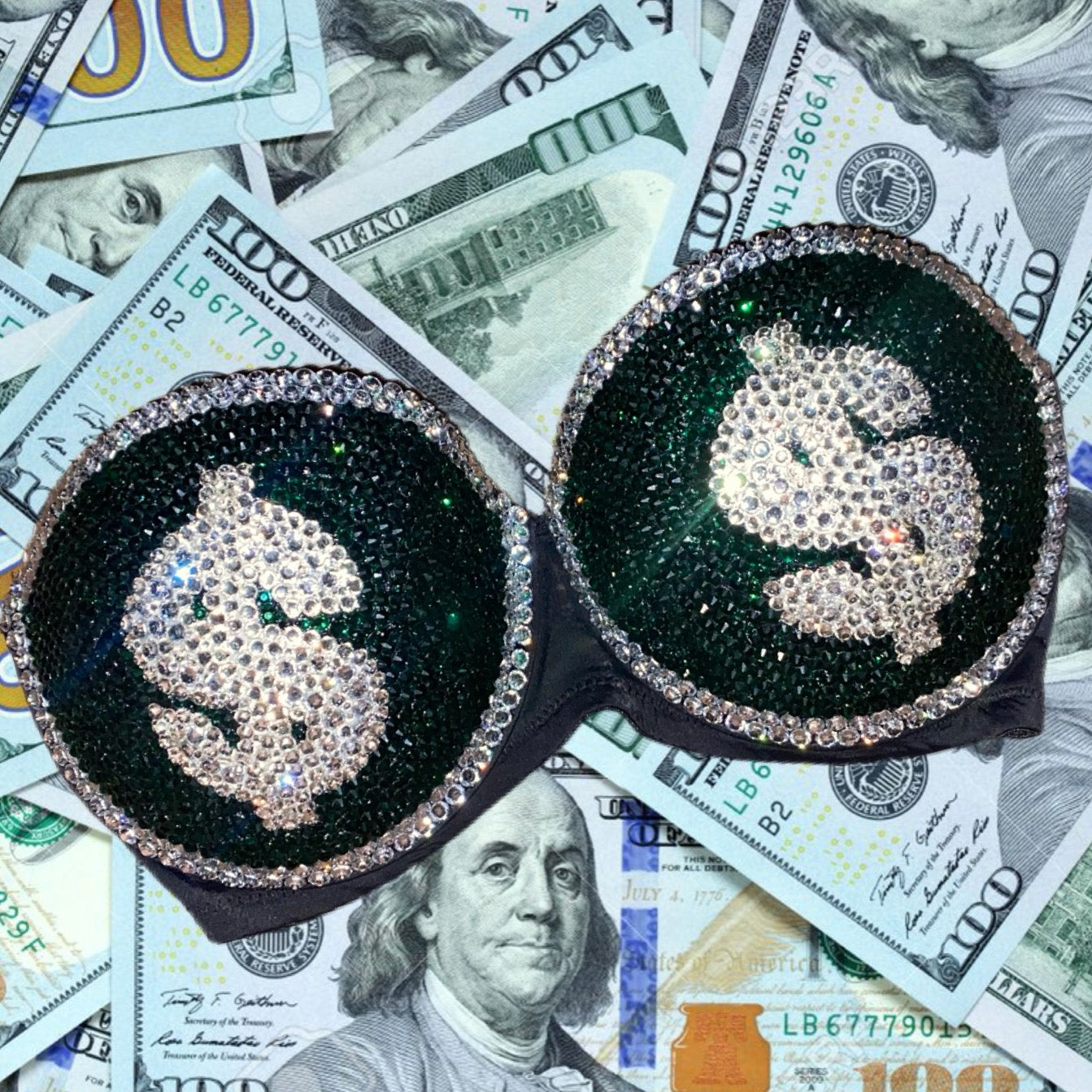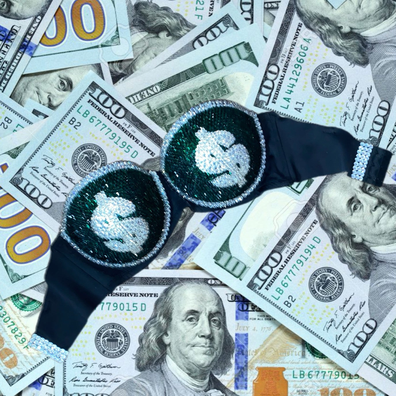 Elevate your style with emerald green luxe crystal T-Shirt Bra. Featuring a stunning crystal money dollar diamond design, Say goodbye to boring bras and add some sparkle to your wardrobe with our one-of-a-kind piece.