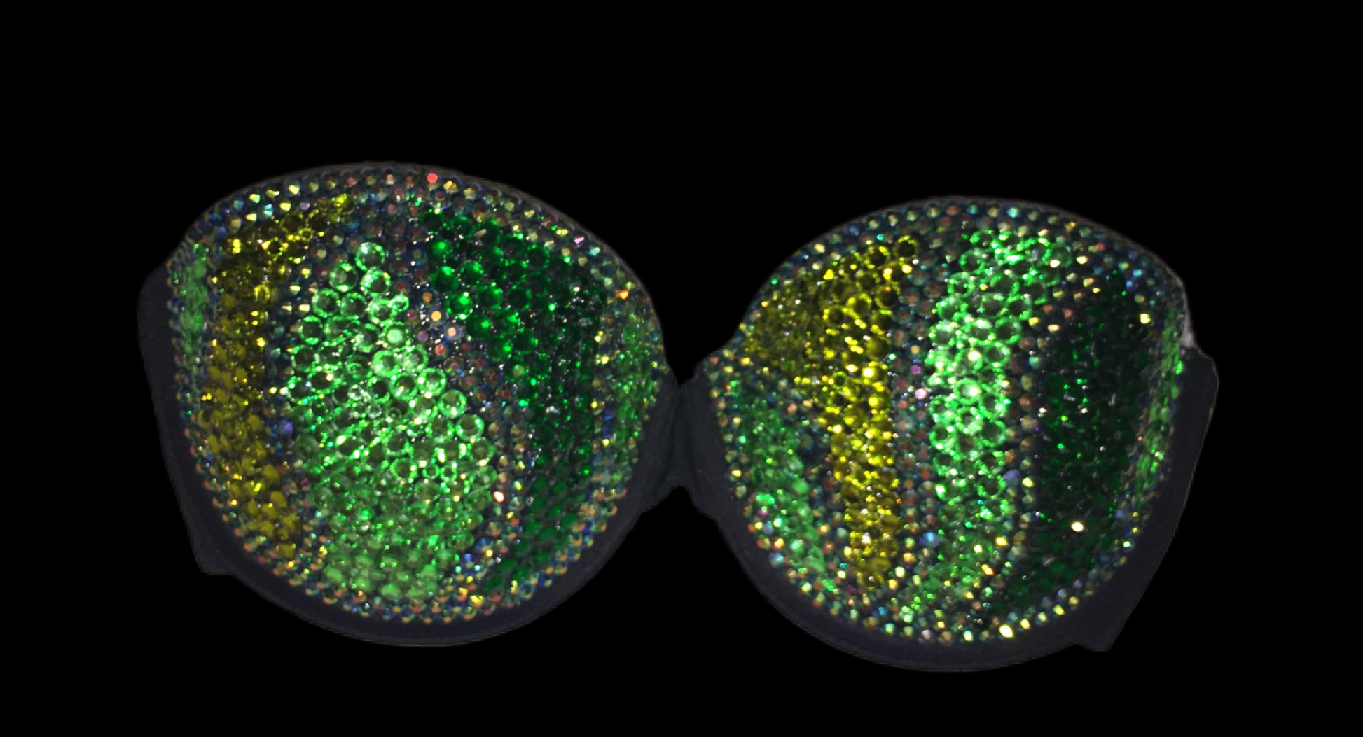Elevate your style with green mix Crystal Strapless Bra. Featuring a stunning green swirly diamond design, Say goodbye to boring bras and add some sparkle to your wardrobe with our one-of-a-kind piece.
