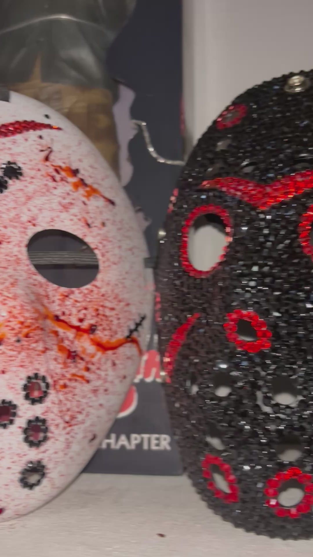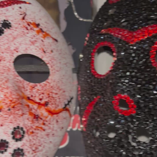 Discover the ultimate horror experience with our Crystal Jason Mask. Made with real luxe crystals and a custom fake blood horror splash! A must-have for any horror fan. Don't miss out on this unique and high-quality sparkly piece.