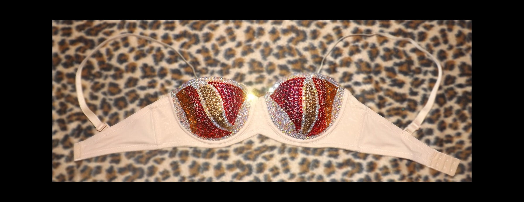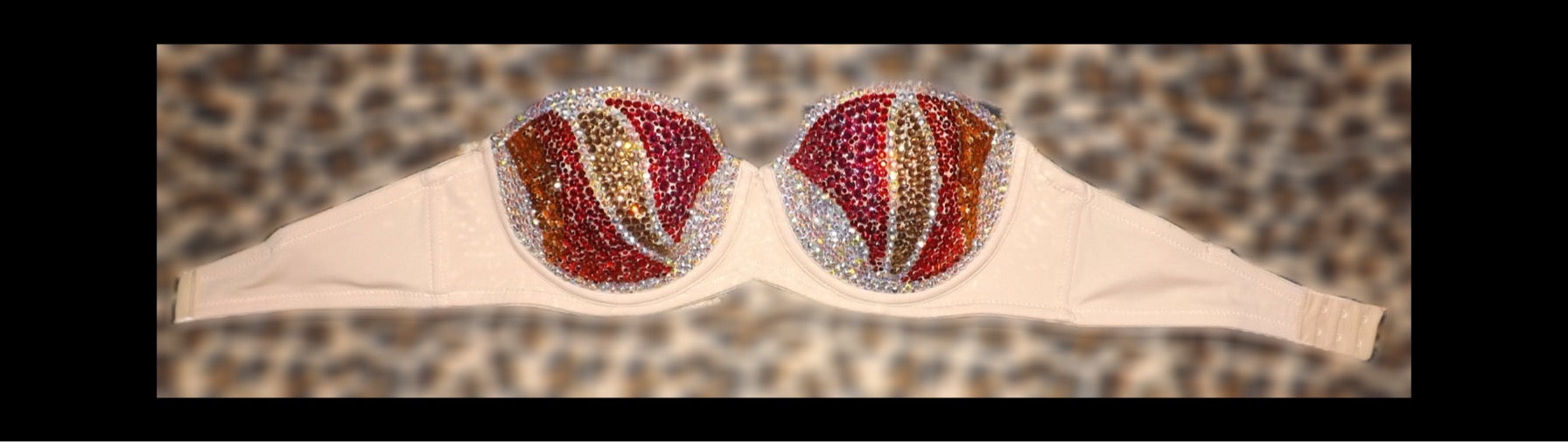 Elevate your style with Orange Pink Topaz Gold & Champagne Gold Crystal Strapless Bra. Featuring a stunning Swirly design, Say goodbye to boring bras and add some sparkle to your wardrobe with our one-of-a-kind piece.