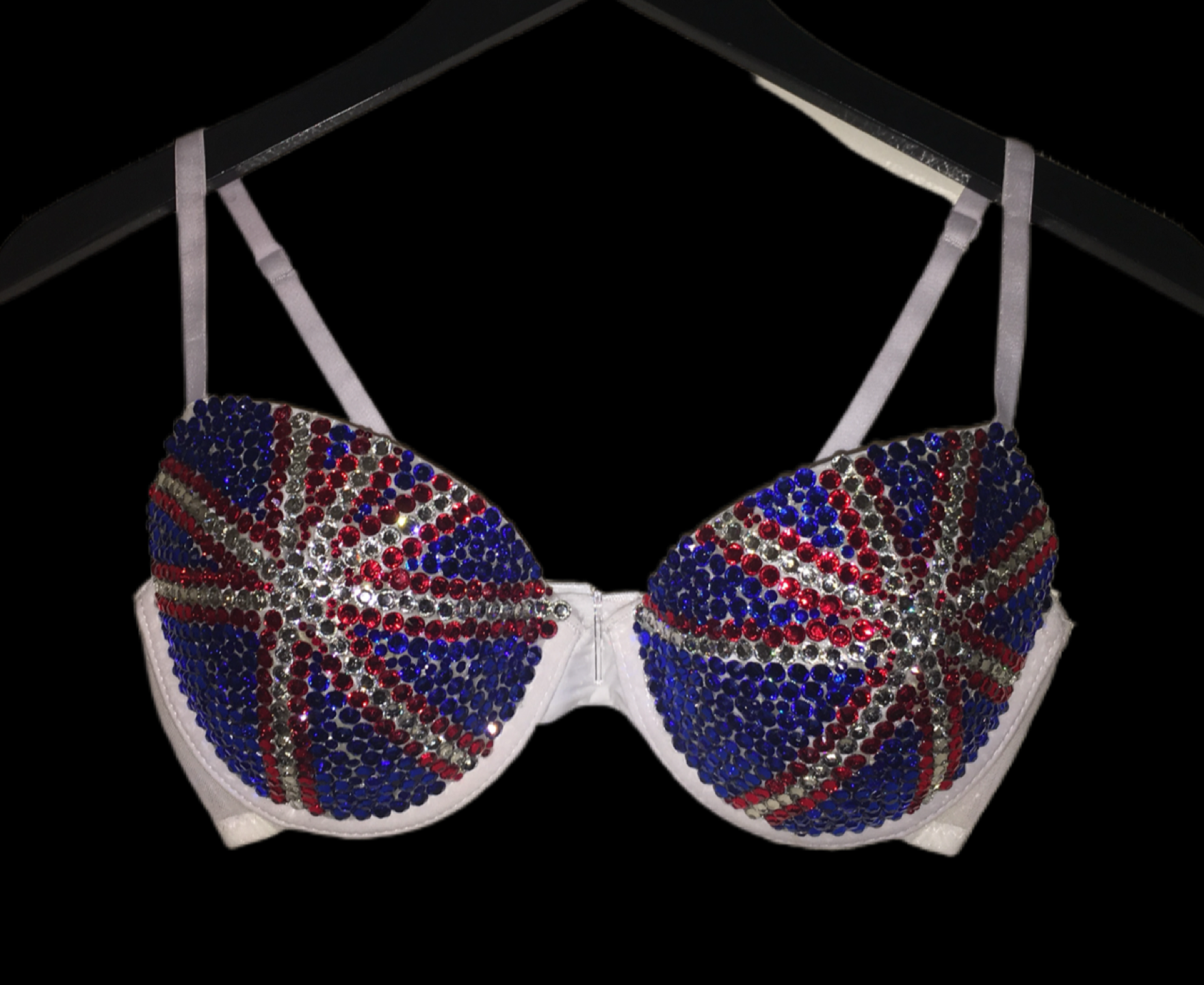 Represent in style with Diamond Crystal flag T-Shirt Bra. Featuring a stunning uk theme crystal design, Say goodbye to boring bras and add some sparkle to your wardrobe with our one-of-a-kind piece.