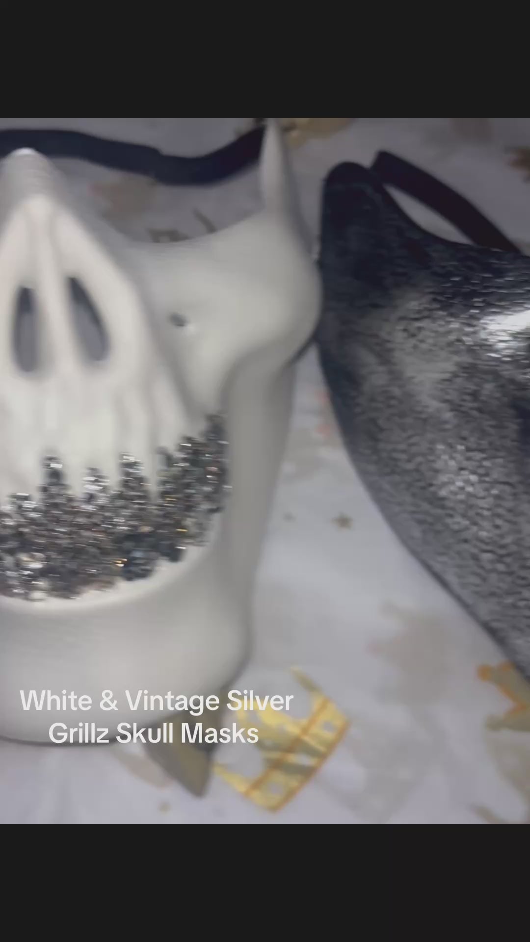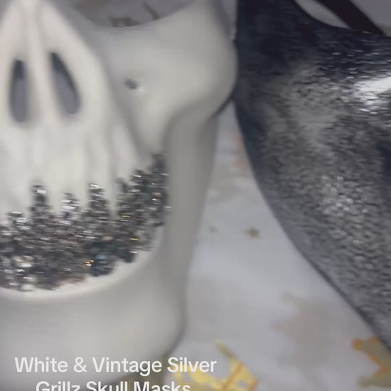This vintage silver half skull mask adorned with silver crystal & Black diamond crystals grillz, The luxe crystal teeth reflect light for a dazzling effect, Enhancing the mask’s bold, edgy appearance. Ideal for professional costumes photo shoots raves festivals halloween and so much more! A standout piece that combines durability with high-impact visual appeal.