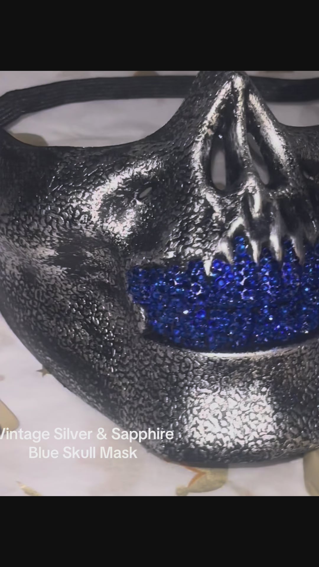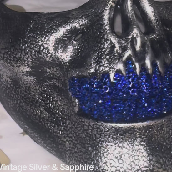 This vintage silver half skull mask adorned with Sapphire Blue crystals grillz, The luxe crystal teeth reflect light for a dazzling effect, Enhancing the mask’s bold, edgy appearance. Ideal for professional costumes photo shoots raves festivals halloween and so much more! A standout piece that combines durability with high-impact visual appeal.