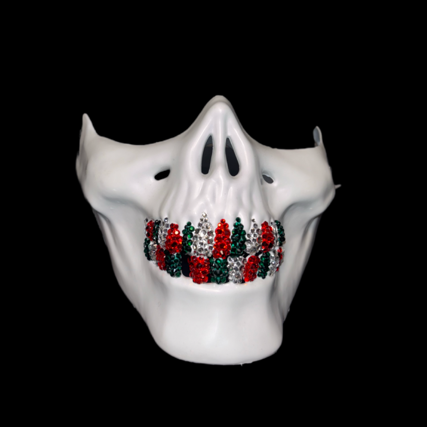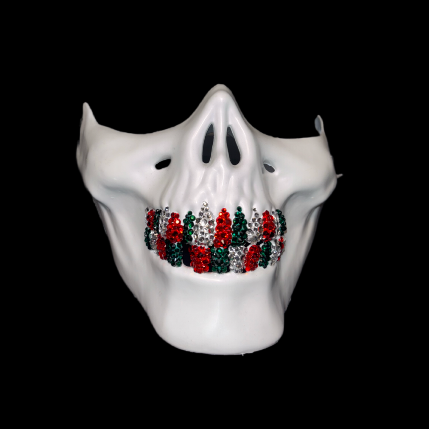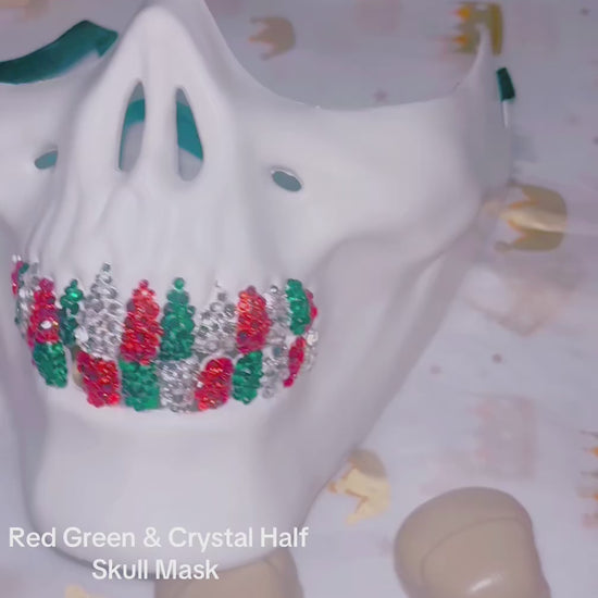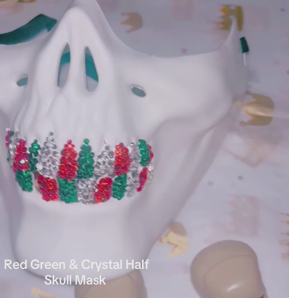 This white half skull mask adorned with Emerald Green Siam Red & Crystals grillz, The luxe crystal teeth reflect light for a dazzling effect, Enhancing the mask’s bold, edgy appearance. Ideal for professional costumes photo shoots raves festivals halloween and so much more! A standout piece that combines durability with high-impact visual appeal.